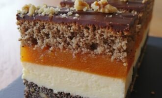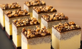 Сирник на литому шоколадному тісті. З маковим шаром, шоколадною глазур’ю та горішками –